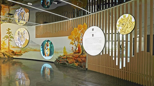 顶部以虎爪造型及线条为灵感做镜面处理,增强内容主题性与空间纵深感,使空间不同层高之间过渡自然。入口处设有验票闸机和储物空间。从序厅前言开始,开启一场东北虎豹探索之旅。